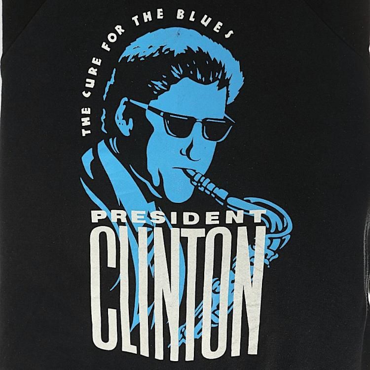 コメント:90年代 フルーツオブザルーム ボディのスエットトレーナーです。 プリントは1992年6月の大統領選のキャンペーン中にTV番組でサックスを披露したビルクリントン。 その後、見事当選をはたしたのは周知の事実。 アーティスト物の様なデザインですが、実はクリントン大統領という面白いネタになりますね。