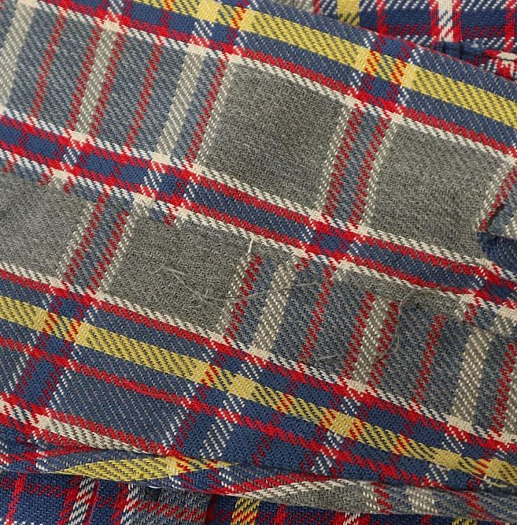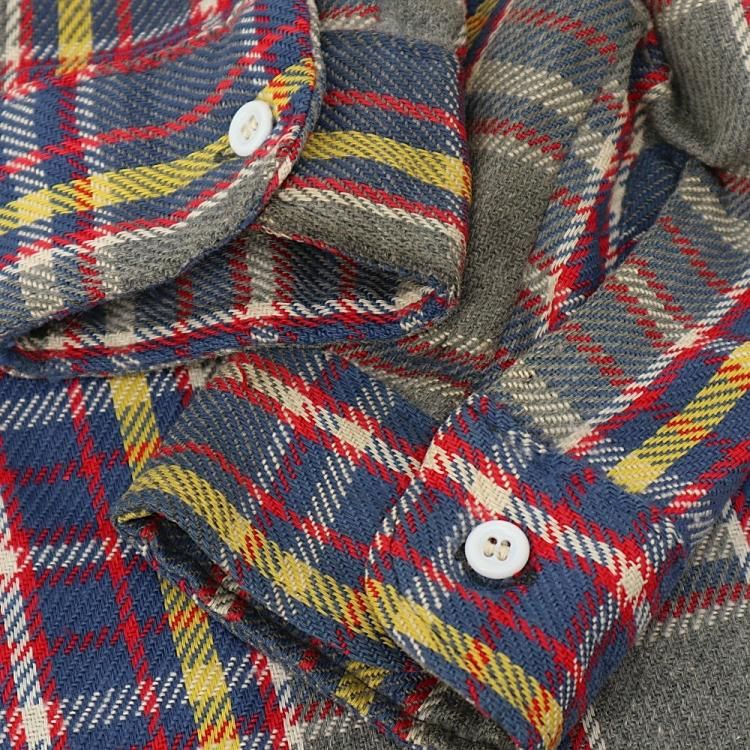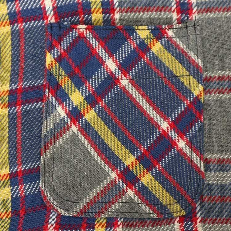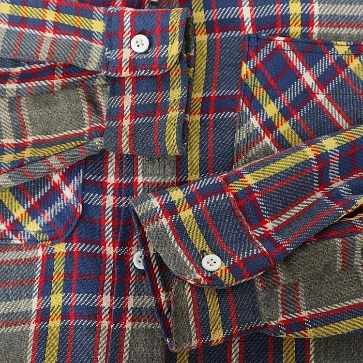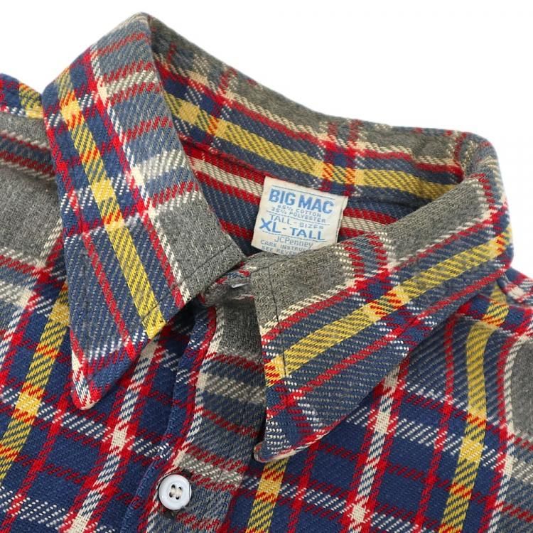 コメント:70年代のBIG MAC ヘビーネルシャツです。 言わずと知れたアメリカ三大ストアブランドの1つジェーシーペニーのプライベートブランド。 灰×青に赤や黄色が効いた チェックは他では見ない組み合わせ。 ベースが灰色だからか派手になりすぎず、ちょうどよい主張具合。 大きめサイズなので、リバースウィーブの上からも羽織れます。