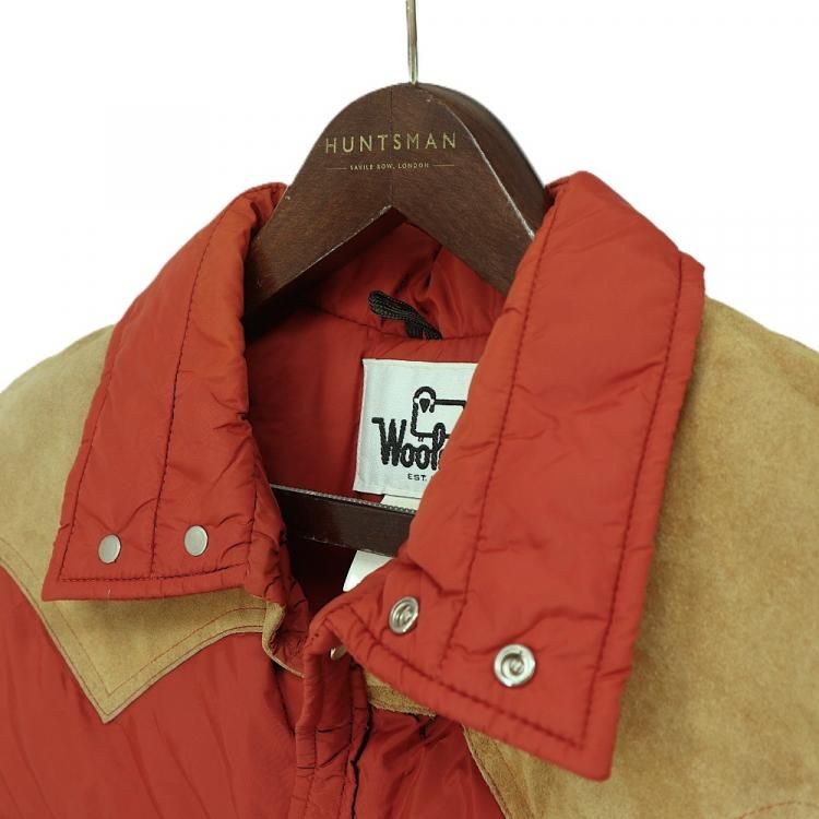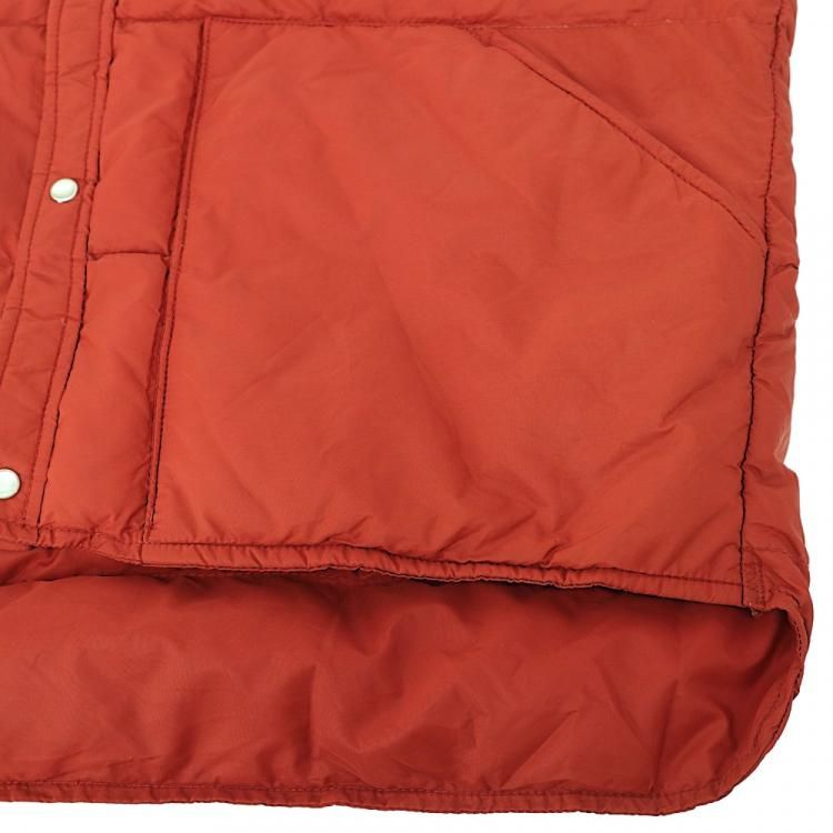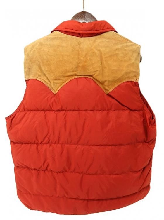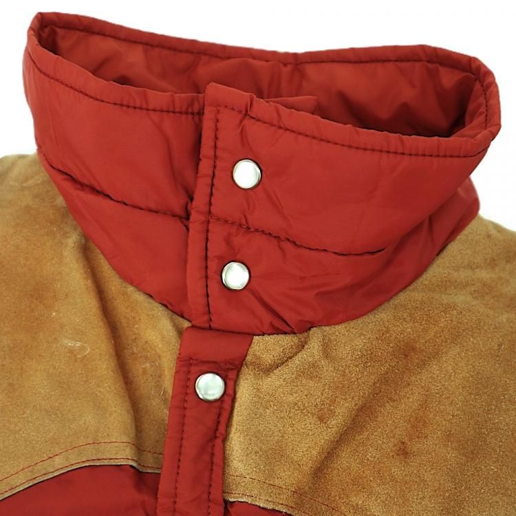 コメント:70年代のヴィンテージ ウールリッチのダウンベストです。 赤茶色のナイロンシェルに茶色のスエード切替。 某ブランドのダウンベスト同様ウエスタンヨークにパールボタンのウエスタンスタイル。 襟にボリュームが無いのでパーカーでも合わせやすくなっています。