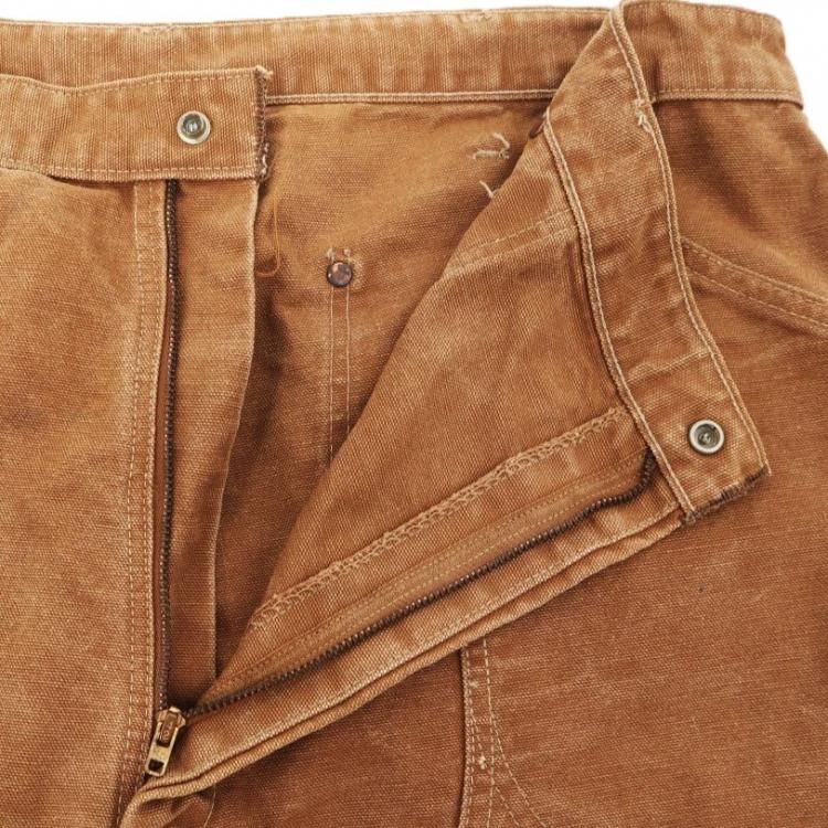 コメント:60~70年代のヴィンテージ カーハートの ダックペインターパンツです。 ダブルニーはここ数年で一気に人気アイテムになりましたね。 こちらは腰のパッチポケットがダブルニーになる古いモデル。 またカラーもオールド特有のチョコレートのようなブラウン。 デカCのドットボタン、クロッチリベット、プリントタグ、ユニオンチケット、42タロンジップ。 こちらゴールデンサイズですよ! 一目でヴィンテージと分かるパンツです。