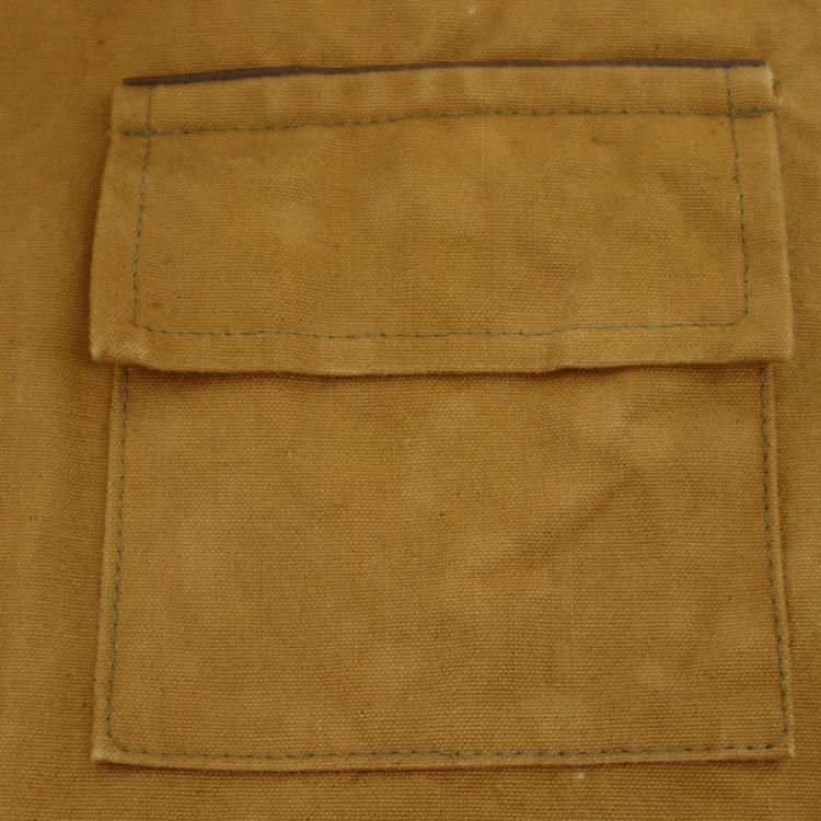 コメント:おそらく70年代のヴィンテージ ダックスバックのハンティングジャケットです。 袖裏・襟がコーデュロイ切替になった3ポケットの王道スタイル。 ポケットのフラップに別生地を挟み込んで装飾を行う洒落たディテール。 袖・ボディ共に2重構造で生地との間がゲームポケットになっています。 サイドのスリットや身頃内側のスリットからアクセス可能。 両腰ポケット内にブレットホルダー。 大きめのポケットフラップが可愛いですね。 丈夫なコットンキャンバス地のジャケットは、火を使うキャンプの時にもピッタリだと思います。