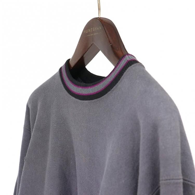 コメント:90年代Champion社製 リバースウィーブ スエットトレーナーです。  リブラインでは珍しいチャコールグレーに目の刺繍のみのデザイン。 黒×紫×灰のラインも洒落てます。