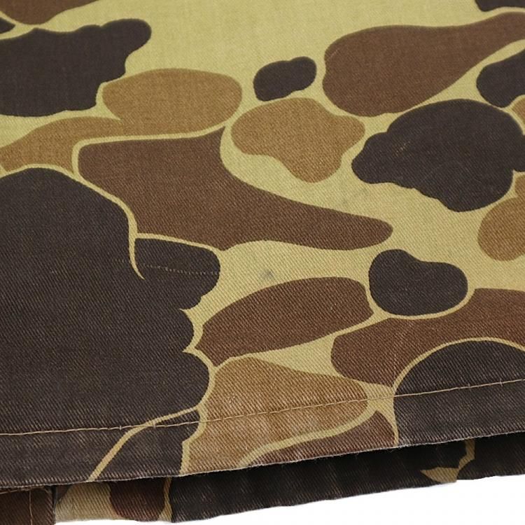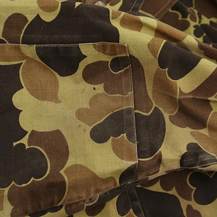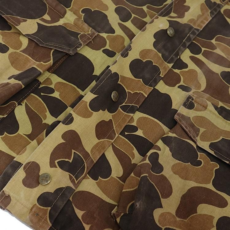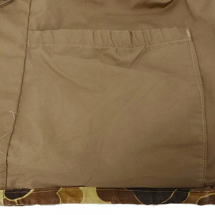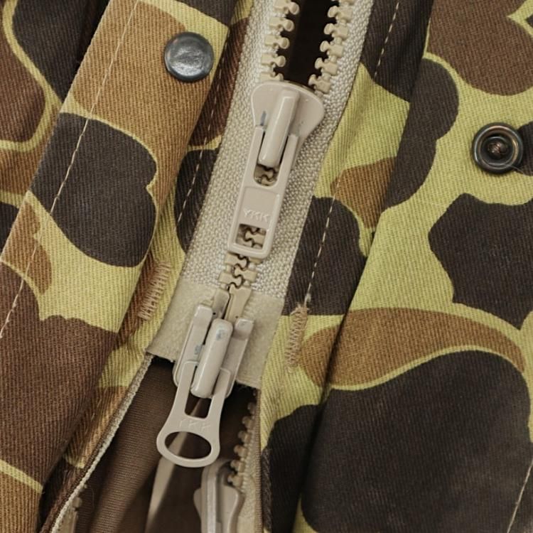 コメント:70年代のヴィンテージ Colombiaの ハンティングジャケットです。 ダックハンターカモ柄のコットン・ナイロンツイル生地で、ㇵの字のハンドウォーマーポケット、ブレットホルダー内蔵の腰ポケット、フロントはダブルジップの仕様です。 内ポケットにはジップポケットとパッチポケットを装備。 またライナー取付用のジップが付いています。 ゴアテックスとシンサレートの機能素材を使用した物は、当時ではかなり上位モデルだったんだろうと思います。