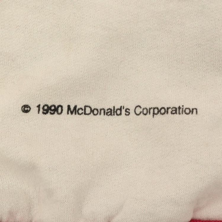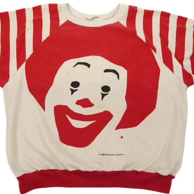 コメント:90年代のマクドナルドのスエットトレーナーです。 マックのマスコットキャラクターでお馴染みのドナルド マクドナルド。 元々は道化師をモチーフにしているので、白塗りの顔に赤い髪や鼻が特徴です。 袖のボーダーとともにインパクト抜群! ワイドシルエットのショートレングスと今っぽいシルエット。 バージョン違いでハンバーグラーもあるようです。
