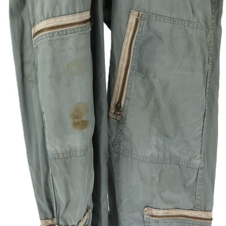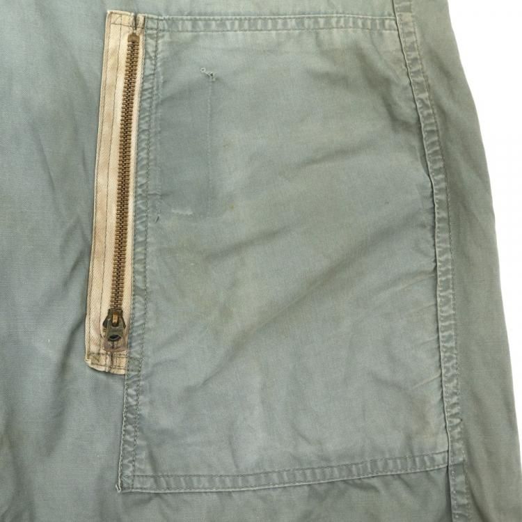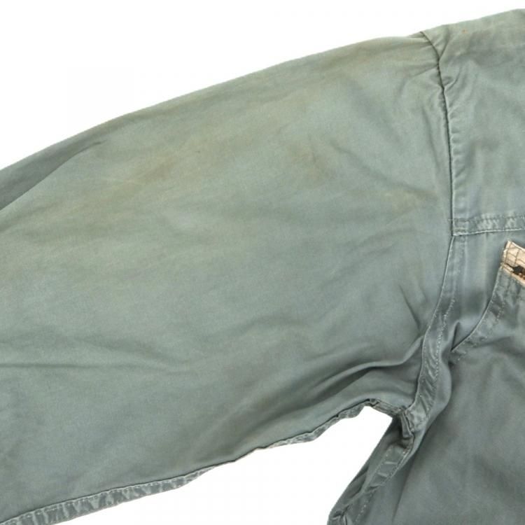 コメント:50年代のヴィンテージ SUIT, FLYING, MAN'S VERY LIGHT TYPE K-2B のミルスペック6265Bです。 こちらは丸襟、胸元にオキシジェンタブが付き、ジッパーのテープがベージュ色、コの字留コンマーのジップ、左肩にはしっかりとデカールが残っています。 ジップは全てコンマー社製。 サイドのジップは貫通式になっています。 ベリーライトゾーン用のツナギの為、30℃〜50℃の温度帯を想定した軽く薄手の生地を使用しています。 エアフォース特有のセージグリーンのボディにベージュのテープが良いですよね。