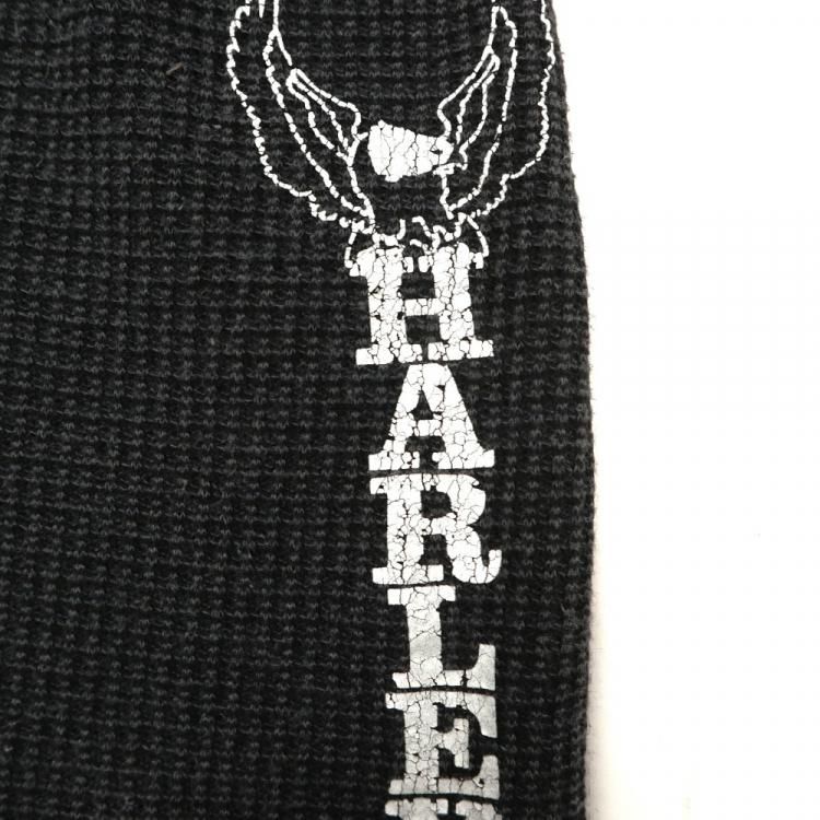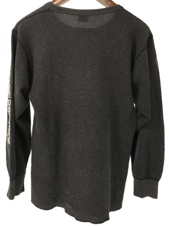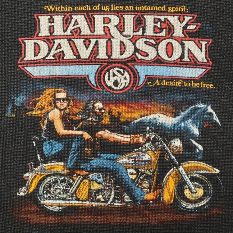 コメント:80年代 ジェイイーモーガン製のサーマルです。 ブラックボディでフロントには馬とハーレーダビッドソンにノーヘルで2ケツしている絵柄、袖にハーレーダビッドソンのロゴがプリントされています。 フェードしたブラックに3面プリントと、ハーレーらしさ全開のサーマル。 タイトなサーマルTシャツでは嬉しい大きめサイズです。