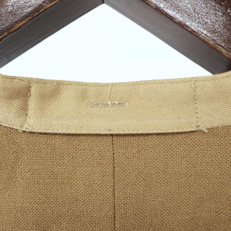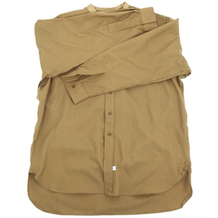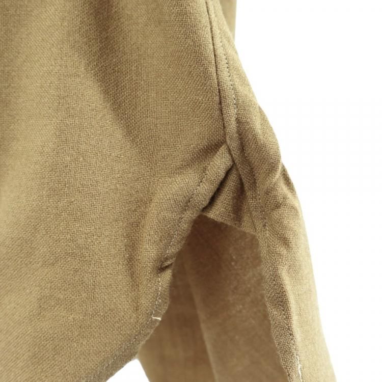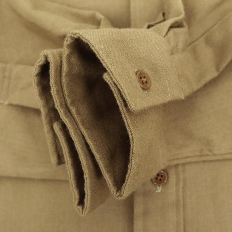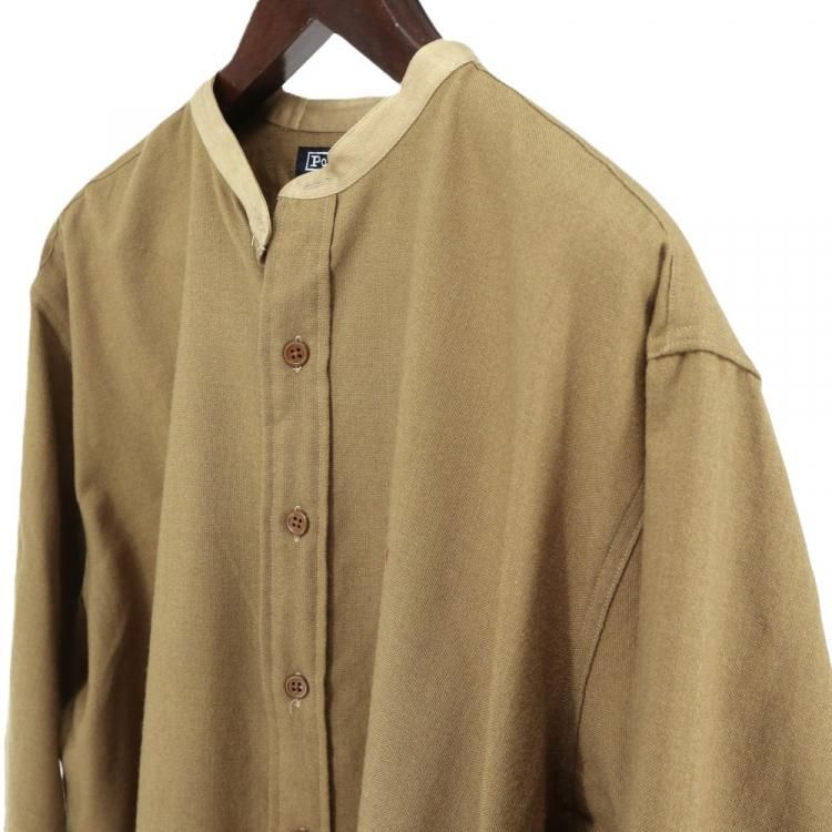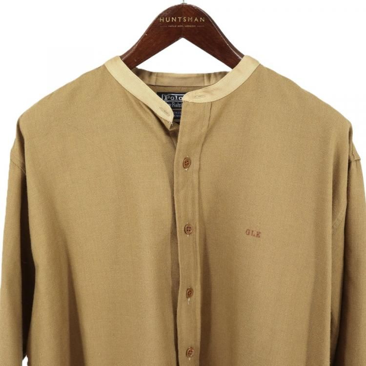 コメント:90年代 ポロ ラルフローレンのウールシャツです。 こちらは襟を取り付ける事が可能なデタッチドカラーのシャツになり、トップはボタンが付かずボタンホールのみで、後ろの首元もボタンホールがあります。 後ろ身頃が長くサイドマチ付き。 胸元には GLK のイニシャルが同系色で刺繍されています。 色はベージュ系のカーキになり、落ち着いたイイ色です。 シルエット的にもグランパシャツに近い印象です。