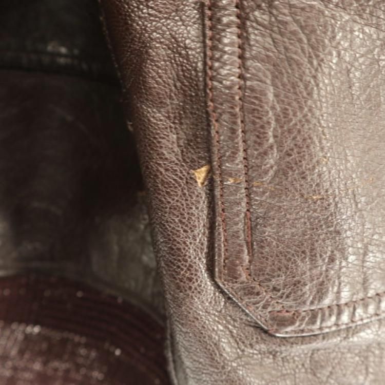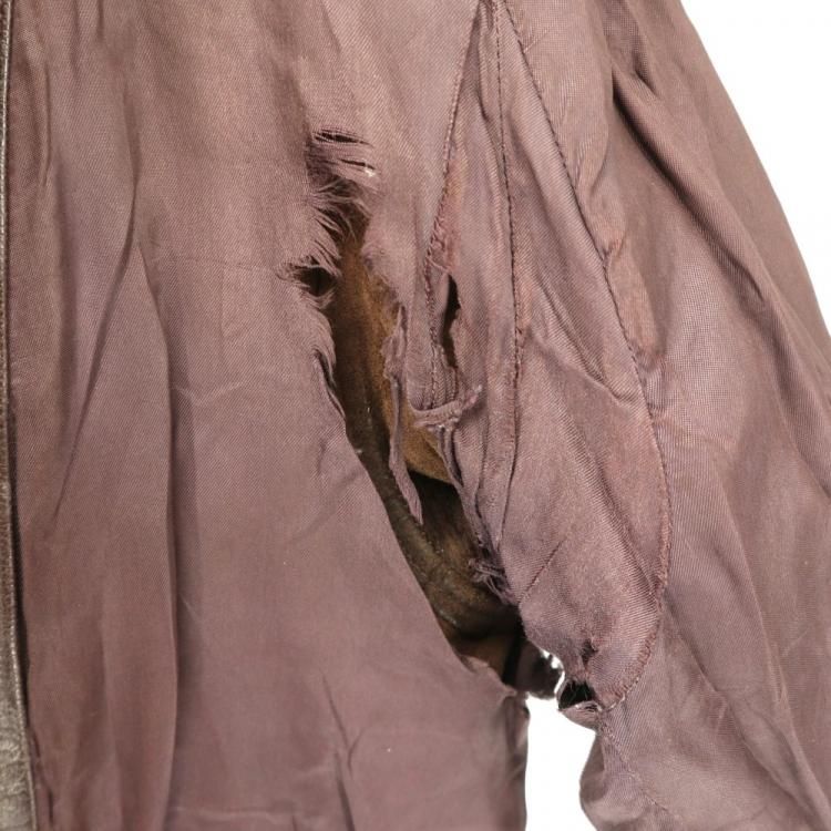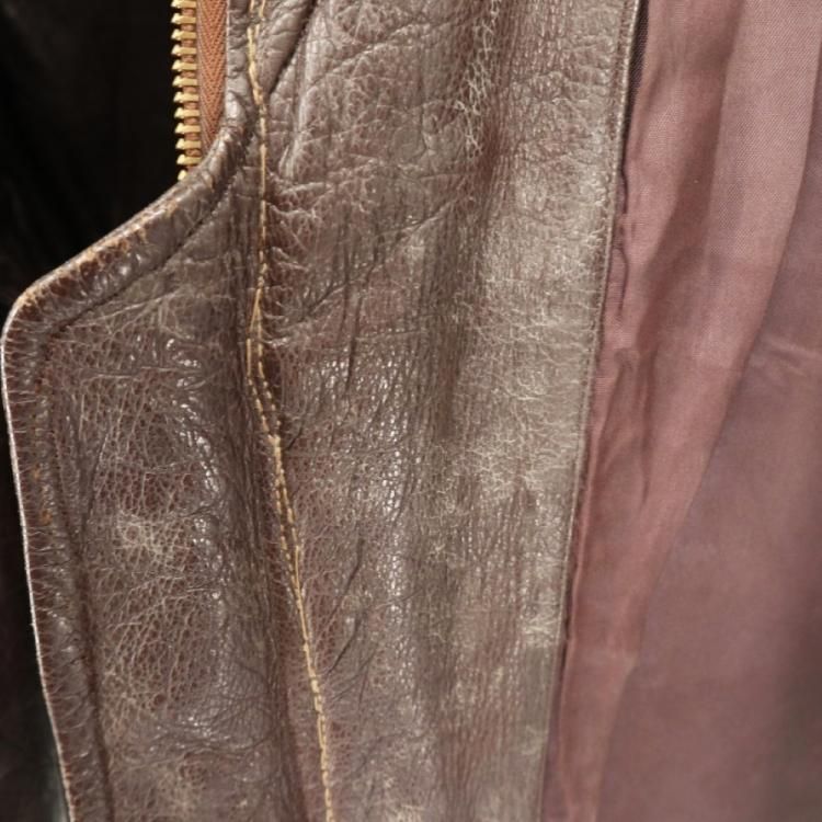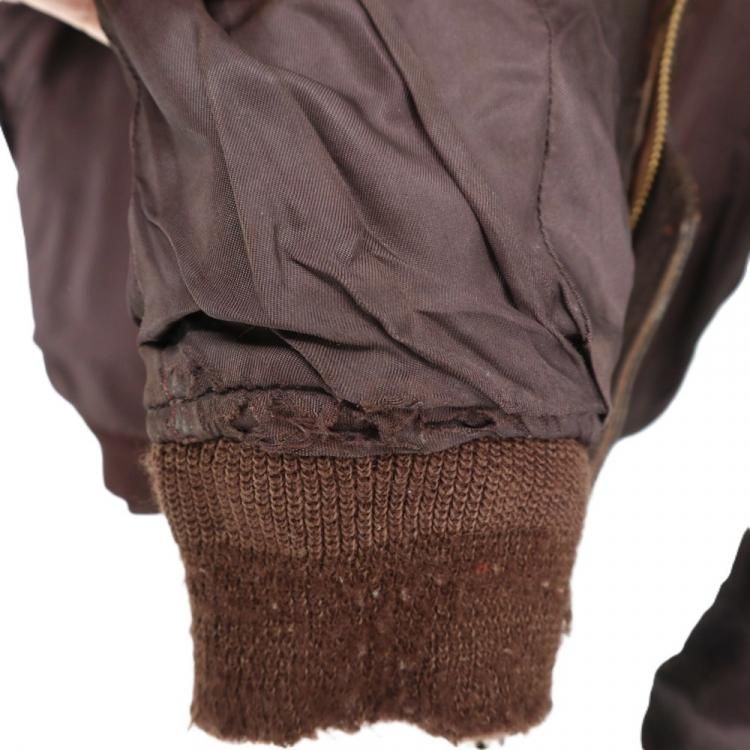 ジップが交換されています。 ジップのテープが縫われていない箇所があります。 左ポケットのボタンが交換されています。 袖と裾のリブの色合いが異なるので、おそらくリブが交換されています。 全体的に使用感があり、リブに毛玉・ダメージ、裏地の破れ、所々に白カビ・傷・汚れ・擦れがあります。