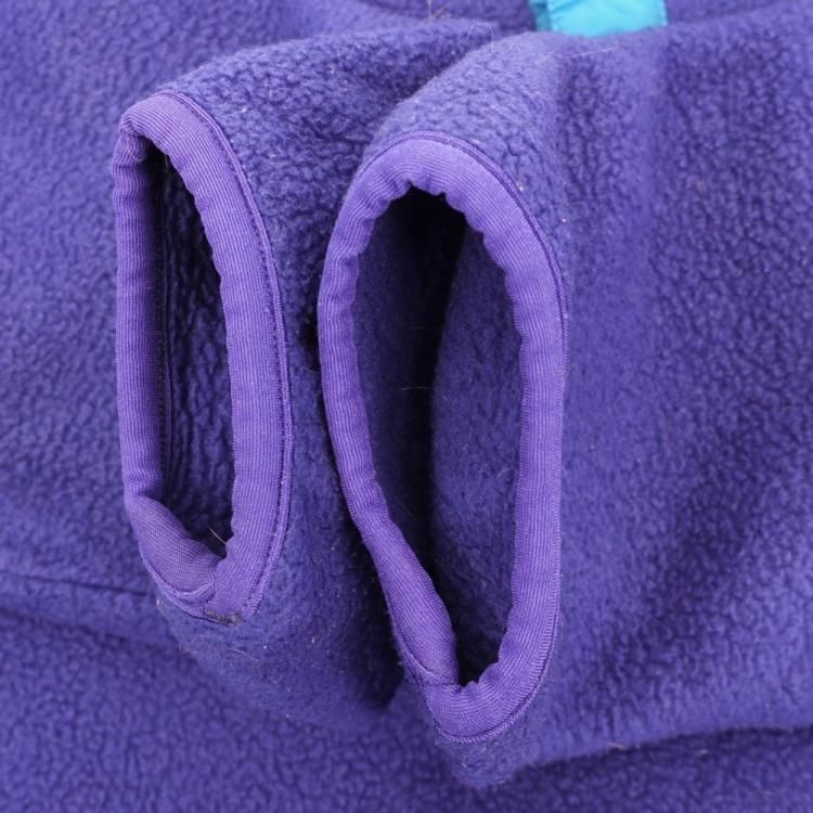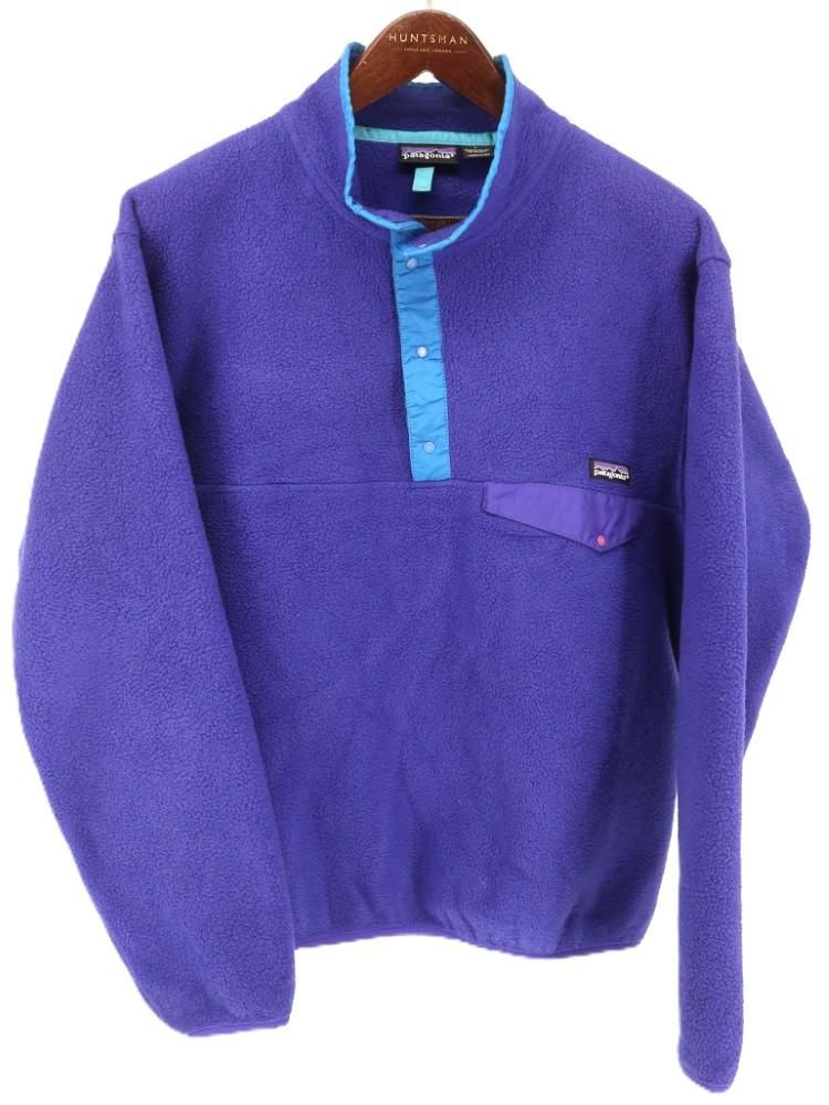 コメント:90年代 パタゴニアの保温性と速乾性を備えた中肉厚な シンチラ フリース生地を使用したスナップT です。 青味が強い紫で、袖・裾ののトリムとポケットのフラップは同系色です。 首元はブルー系で、内側のテープはターコイズブルー。