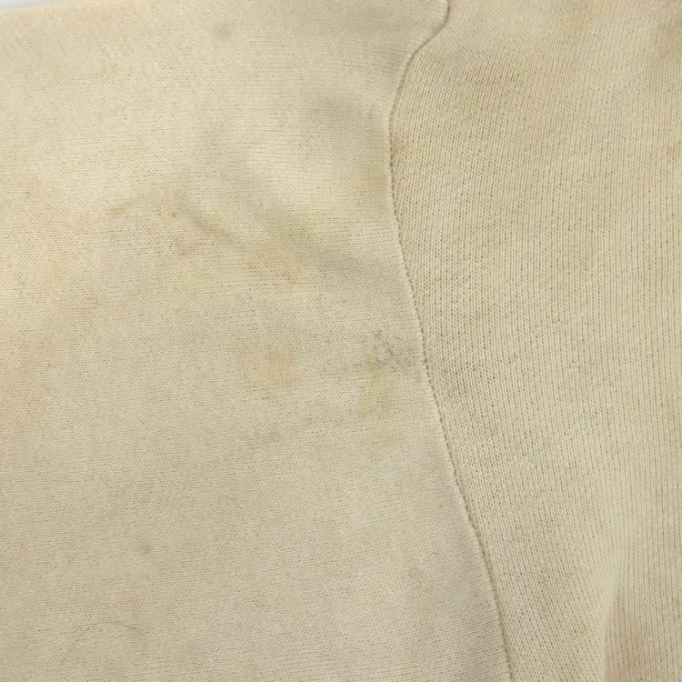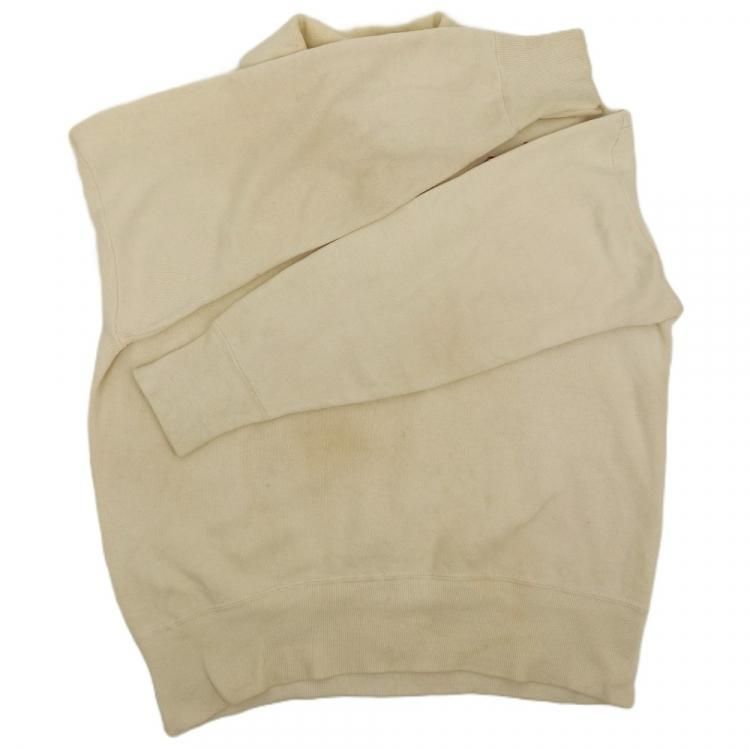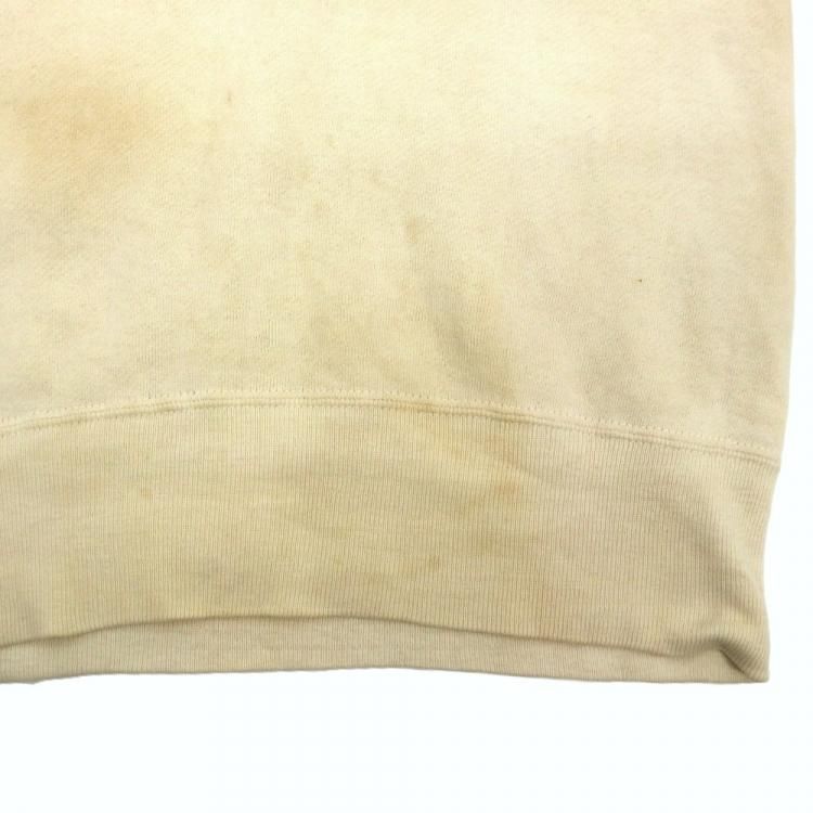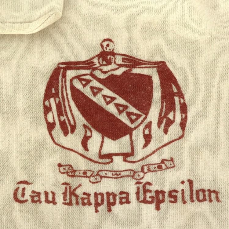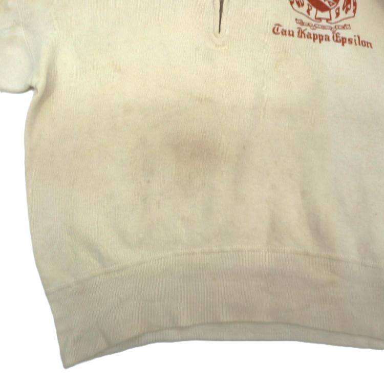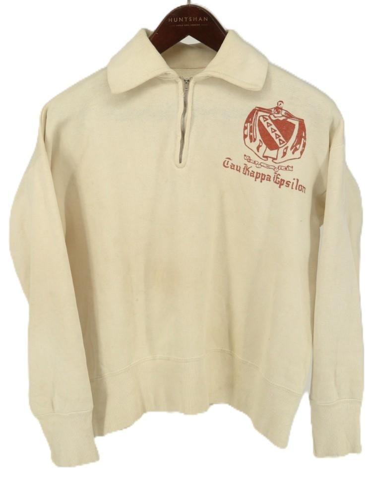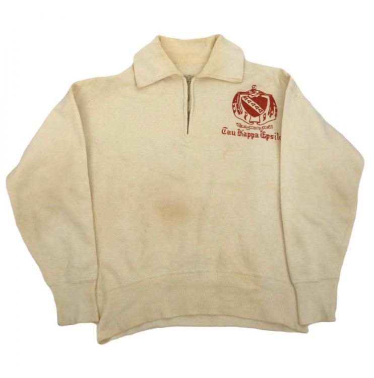 コメント:おそらく50年代あたりのヴィンテージ スエットトレーナーです。 襟付きハーフジップのデザインで、コの字留のLANCE製ジッパーを使用しています。 左胸には 『タウ・カッパ・エプシロン』のフラタニティの紋章がフロッキーでプリントされていますが、フロッキーは剥がれています。 腹巻リブと呼ばれる約9cmの幅太い筒リブを使用した一目でヴィンスエと分かるスエットです。